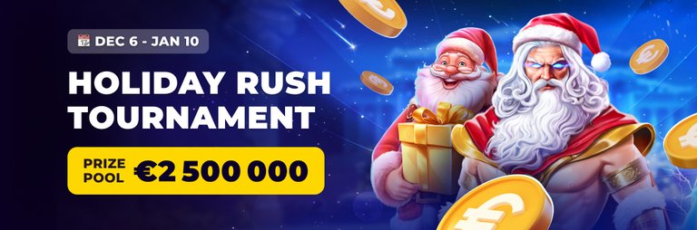 Concentrate your energy and win without stopping. Join the Holiday Rush Tournament from Pragmatic Play and share the €2 500 000 prize pool! Play chilling slots to win fabulous rewards every day and every hour.
